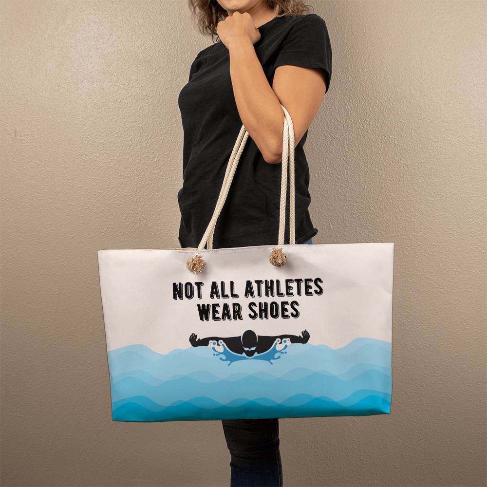 Dive into the spirit of unbridled aquatic enthusiasm with our "Not All Athletes Wear Shoes" Weekender Tote Bag. Whether you're a seasoned swimmer, a casual water enthusiast, or someone who simply believes in the freedom of movement, this tote is your declaration of independence from the ordinary.